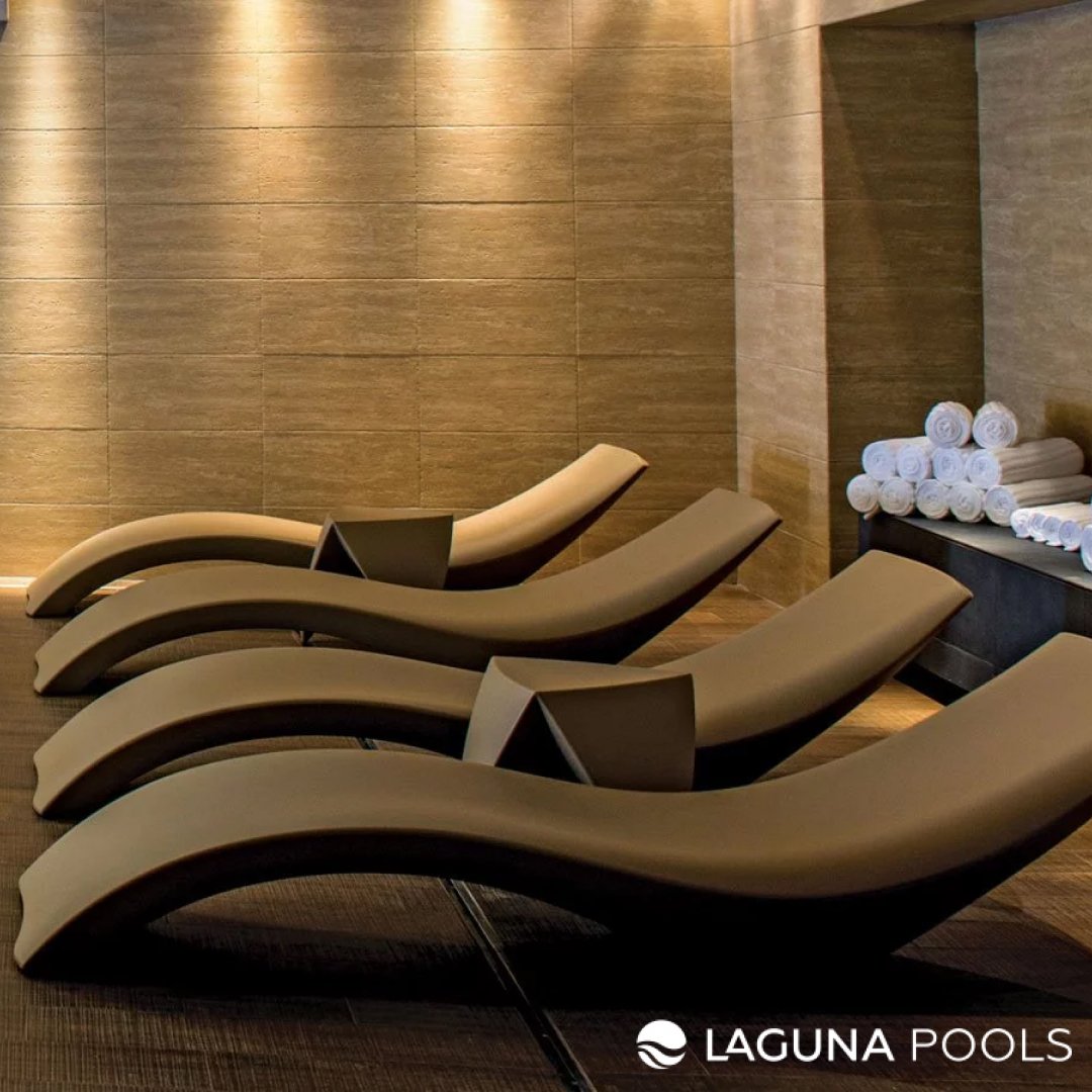 Четыре бежевых шезлонга в зоне отдыха с белыми полотенцами и мягким освещением